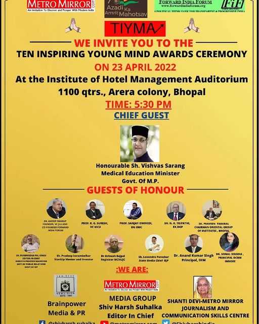 The following are the winners of the TIYMA Awards presented today at the IHM auditorium, Bhopal. Eminent Jury members evaluated the video entries.